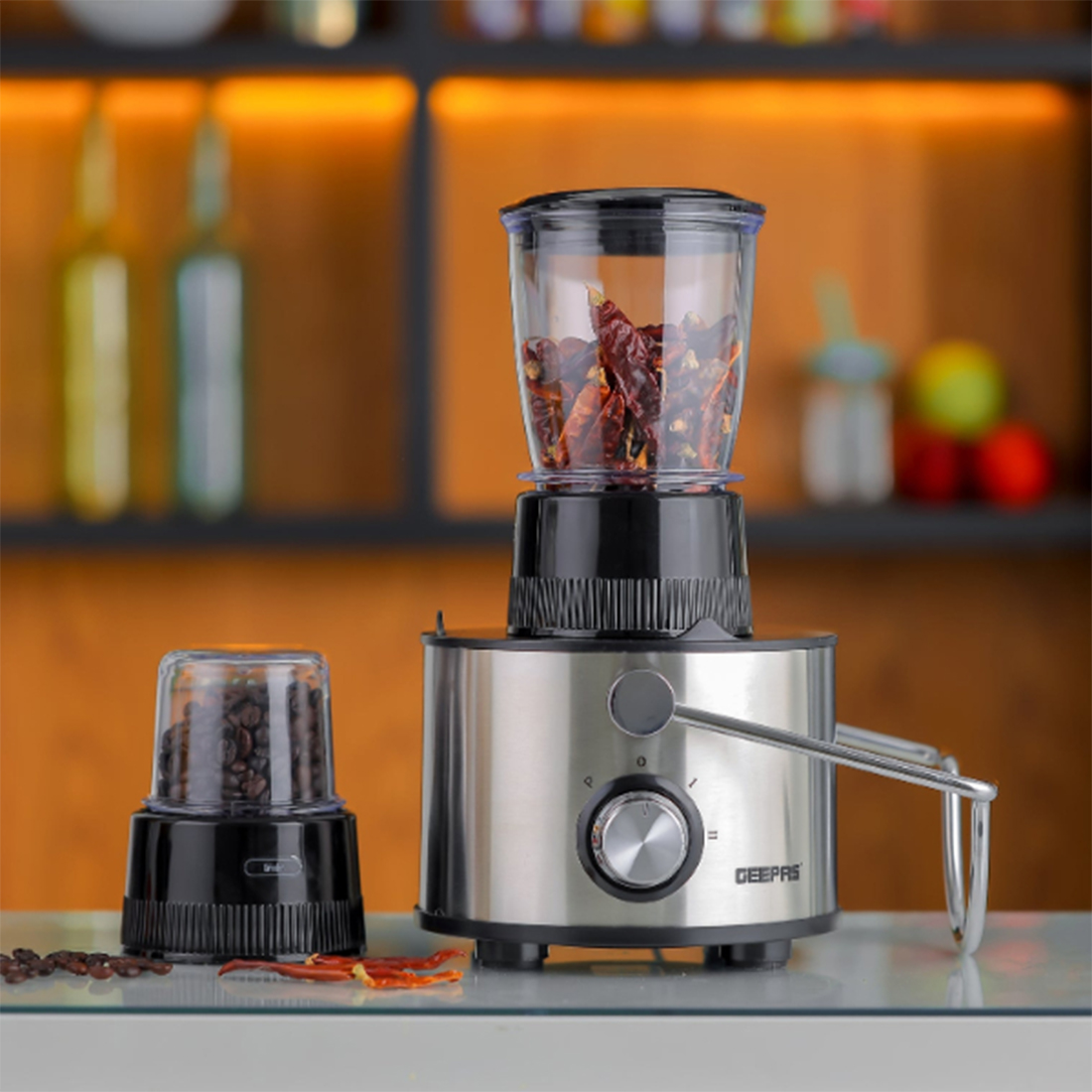 Mixeur et extracteur de jus Geepas 4 en 1 en acier inoxydable – GSB44016 | Moteur puissant de 800 W avec 2 vitesses | Récipient à pulpe de 2 L, gobelet à jus de 1,1 L, bol mixeur de 1,5 L