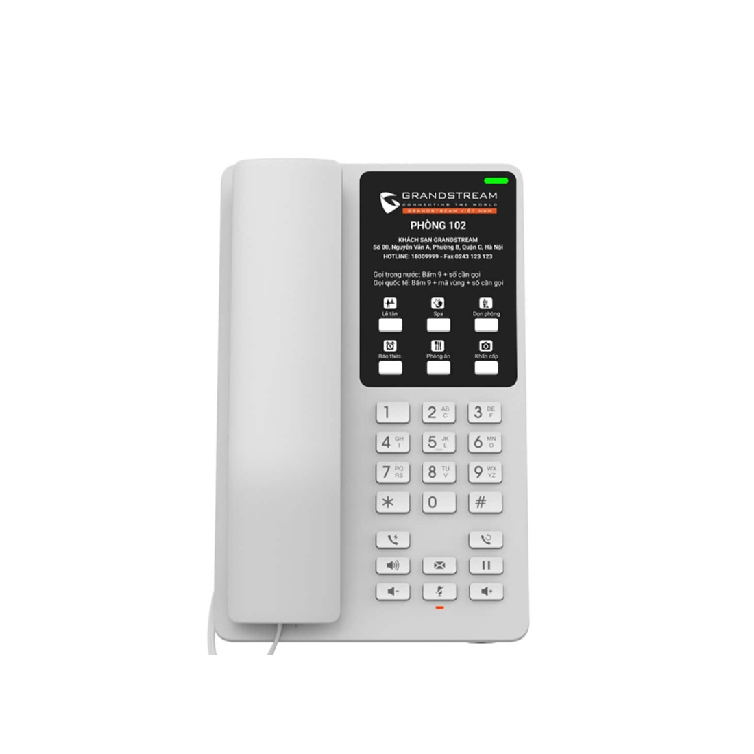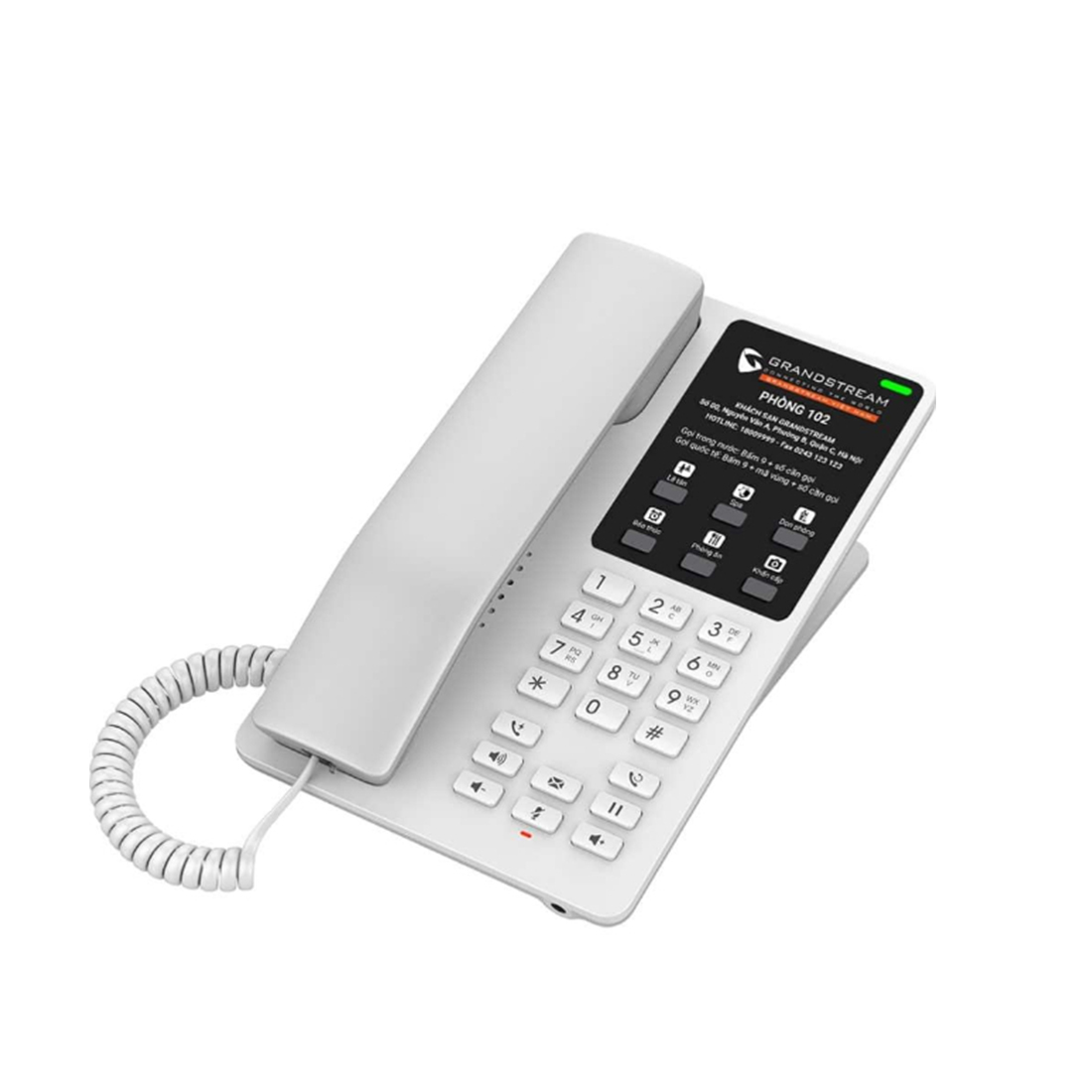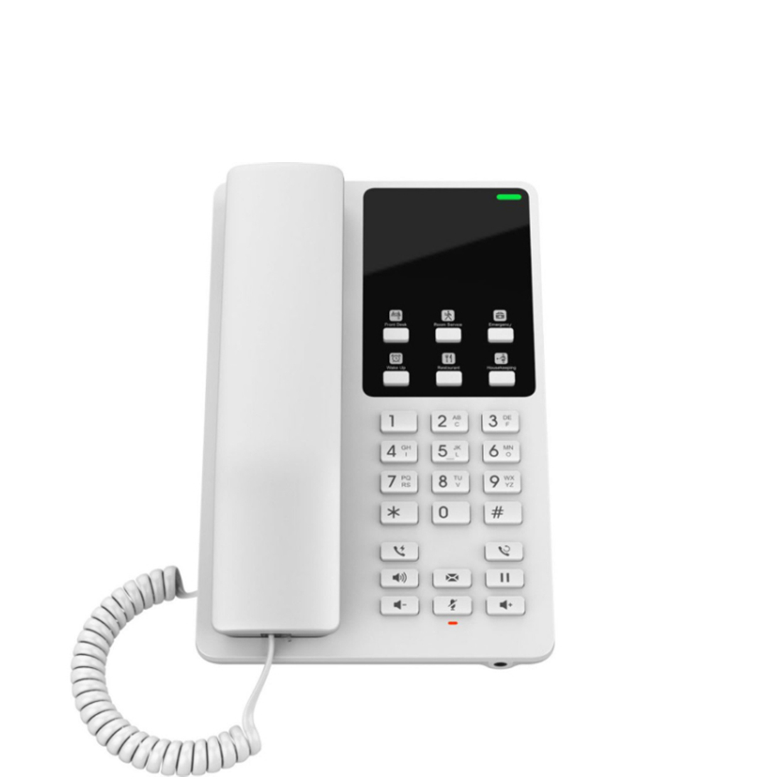 Téléphone IP WiFi pour l’hôtellerie avec 2 lignes SIP 2 appels simultanés, audio HD, fonction mains libres, interfaces RJ45 10/100, port de charge USB-C,. Administration Web, alimentation externe. Couleur blanche