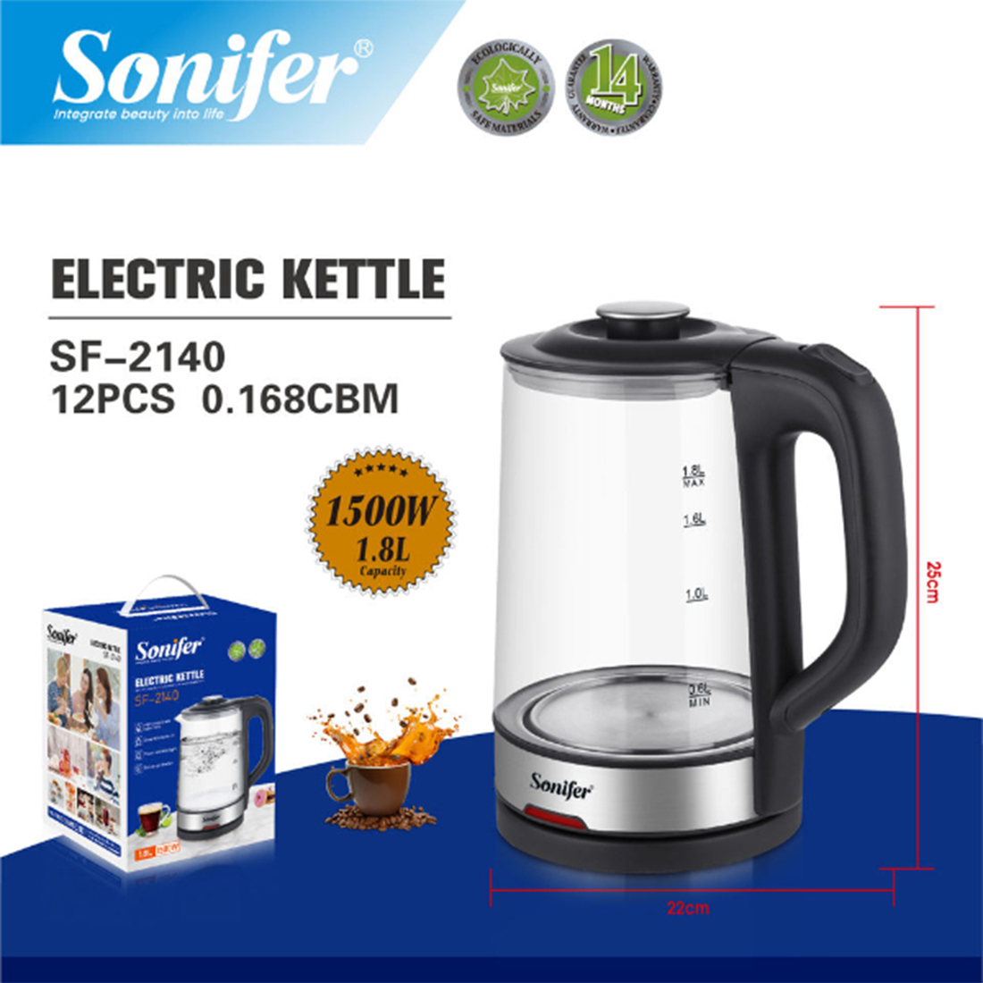 Caractéristiques : Capacité : 1,5L, Verre borosilicate haute résistance, sûr et stable, Voyant bleu LED pendant l’ébullition, Base pivotante à 360°, Élément chauffant dissimulé en acier inoxydable, Protection anti-surchauffe à sec, 220-240 V CA 50/60 Hz 1500 W