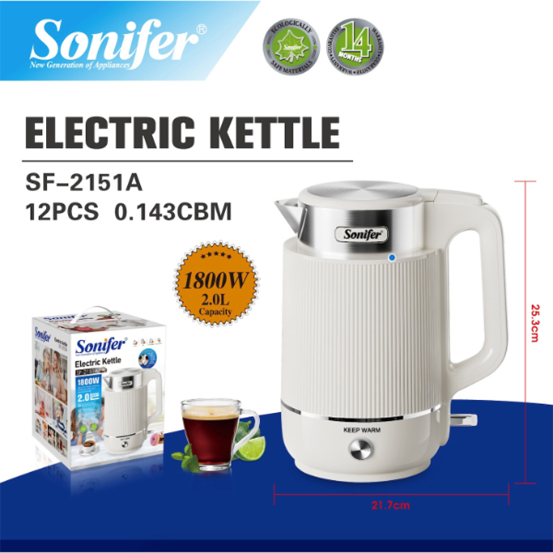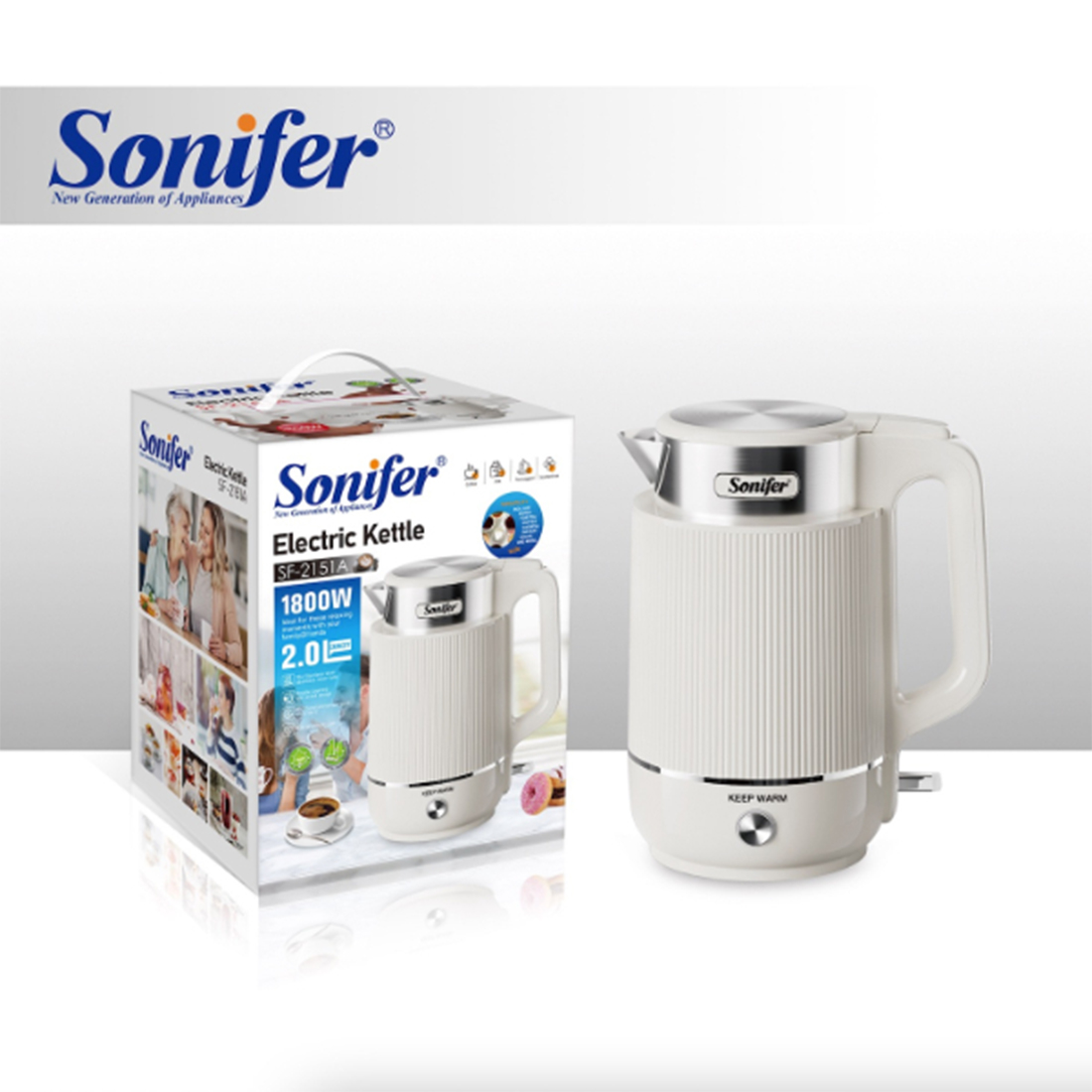Chauffe Eau électrique / Bouilloire électrique 2,0 Litres. Acier inoxydable 304 sans soudure, arrêt automatique, maintien au chaud à 70-80 °C, anti-séchage.